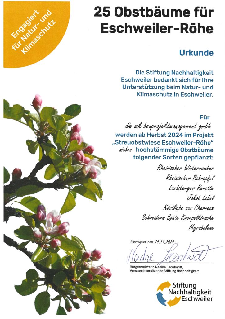 Wir uns an diesem Projekt beteiligt und sind nun stolze Paten von insgesamt 8 Obstbäumen. Diese Bäume wurden gepflanzt, um die Natur zu stärken, die Luft zu verbessern und Tieren wie Vögeln und Insekten einen Lebensraum zu bieten.